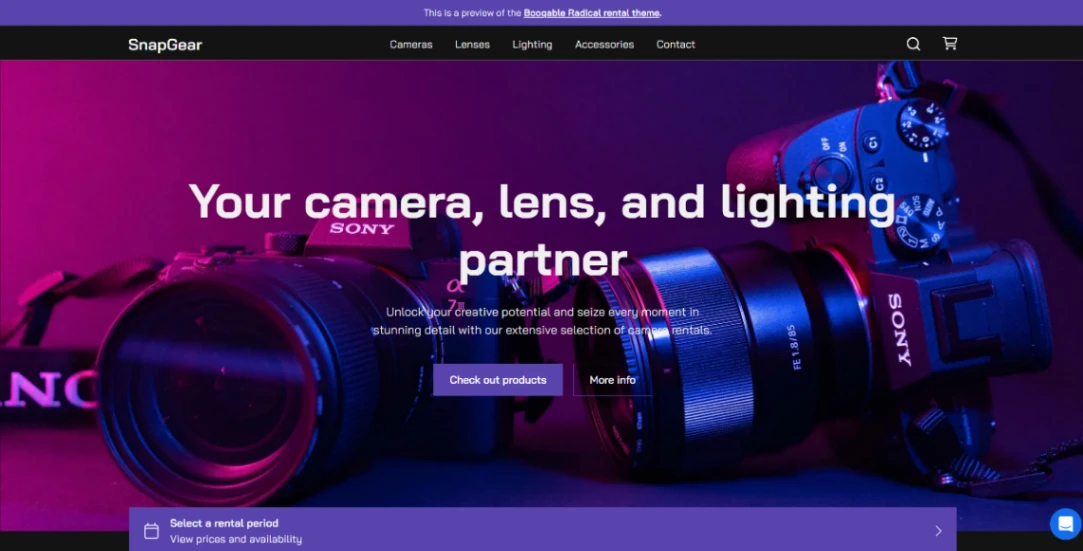 Professional camera and photography gear rental template. Features equipment collections with daily pricing, latest arrivals showcase, customer testimonials, photography blog, FAQ section, and booking...