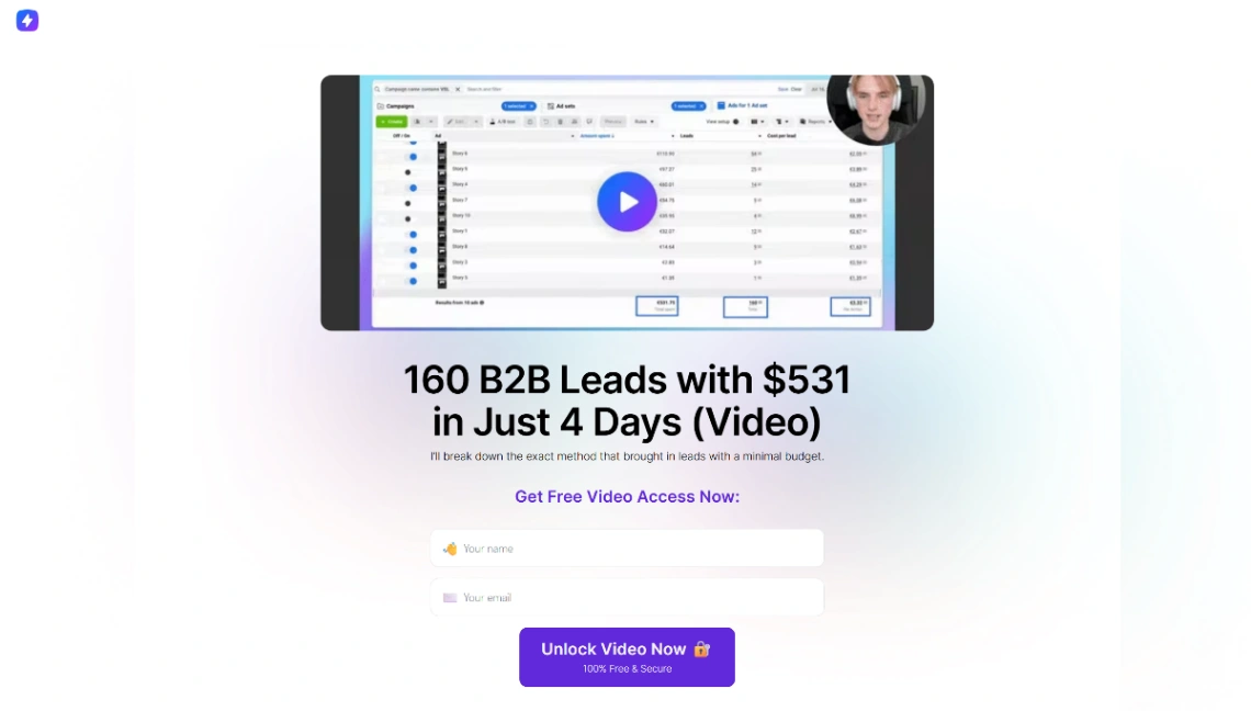 Lead generation page for marketing and sales tools targeting agencies and service providers. Features video training on lead generation strategy, customer success quotes with results, trust badges sho...