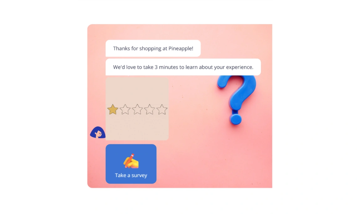 Chatbot template for collecting customer feedback after purchase. Features thank you message, star rating question, survey call-to-action button, conversational feedback collection, product questions,...
