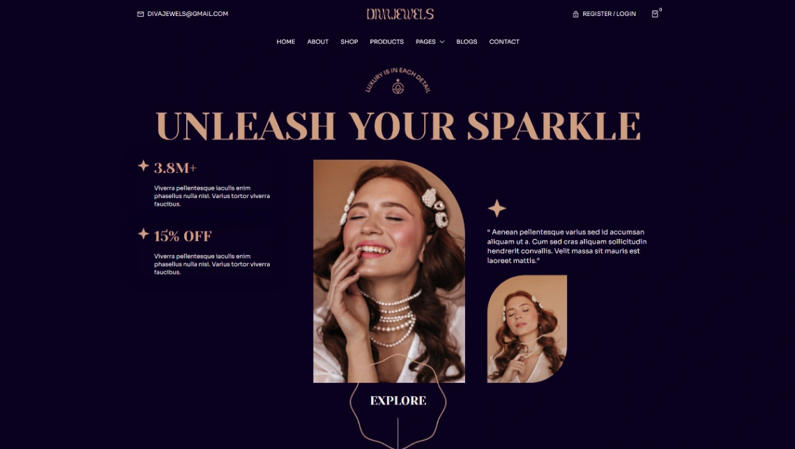 Luxury jewelry eCommerce template with dark aesthetic. Features jewelry category showcase including rings, earrings, pearls, and bracelets, hero section with promotional offers, about page, shop and p...