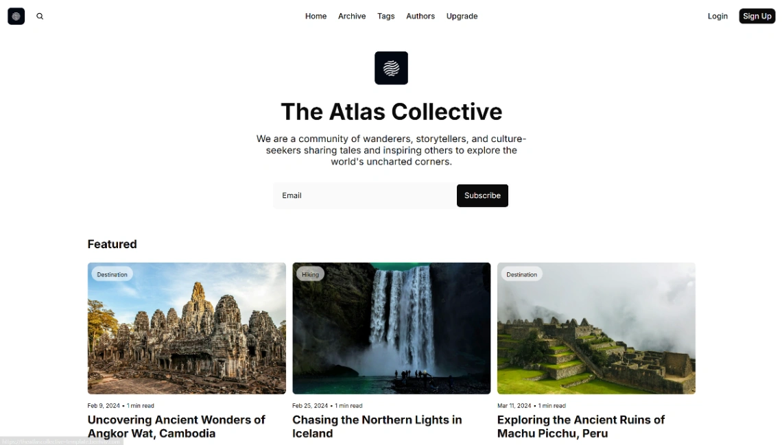 Travel and lifestyle newsletter template for storytelling and exploration content. Features hero section with community tagline, newsletter subscription, featured articles grid with destination tags,...