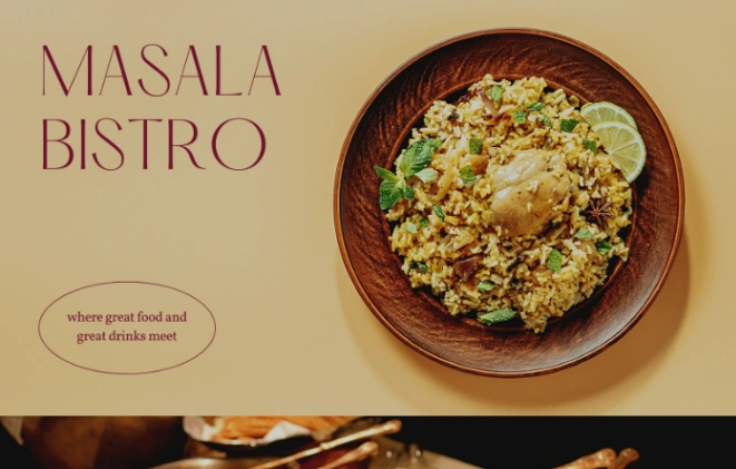 Food and restaurant website template with warm color scheme. Features hero section with restaurant name and tagline, high-quality dish photography, brand messaging, elegant typography, and simple layo...