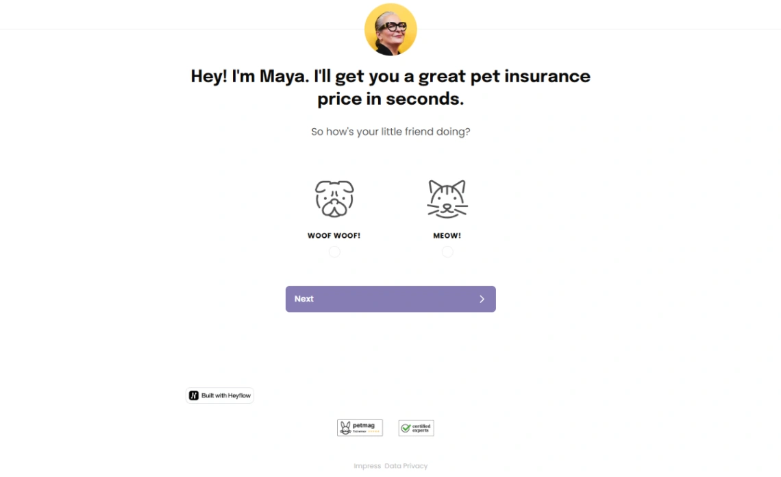 Interactive pet insurance quote funnel with conversational AI assistant. Features personalized greeting with avatar, pet type selection with dog and cat icons, conditional logic routing based on pet s...