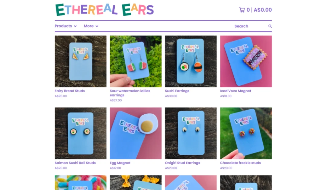 Jewelry e-commerce shop template showcasing handmade earrings, necklaces, brooches, pins, and magnets. Features product categories organized by jewelry type, featured product gallery with quick view,...