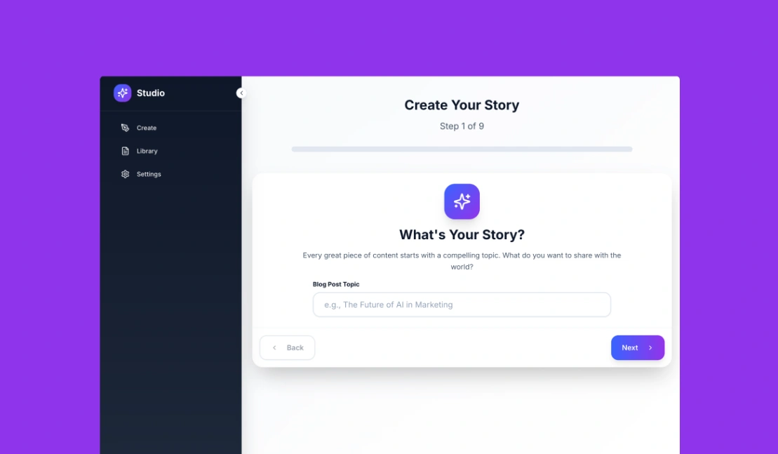 AI-powered content creation platform for startups with premium design. Features sleek interface with collapsible sidebar, modern UI elements inspired by Squarespace, blog post generation, content crea...