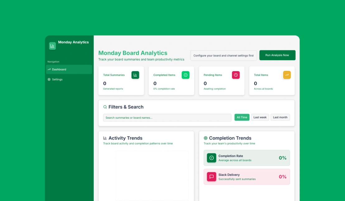 Workflow automation app template for syncing Monday.com data to Slack. Features daily board analysis, automated summaries sent to Slack, historical summary tracking, settings management, and integrati...