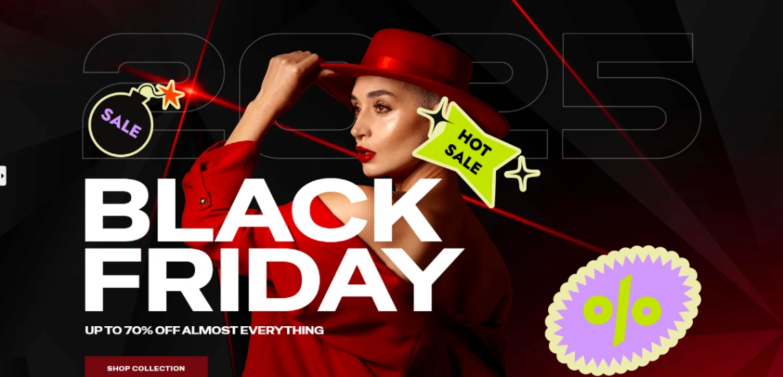 High-converting Black Friday landing page for fashion ecommerce. Features hero banner, countdown timers, featured sales, flash sale section, product recommendations, spinning wheel promo, and FAQ.