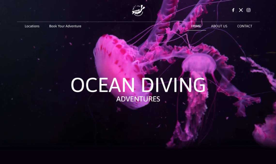 Adventure diving website template for tour operators offering scuba experiences. Showcases dive packages including reef exploration, shark encounters, wreck diving, and night dives with expert instruc...