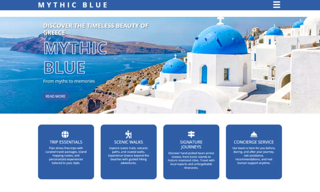Travel agency website template for Greek destination tours and island experiences. Features tour packages with pricing, destination showcase, activity highlights, travel blog section, customer testimo...