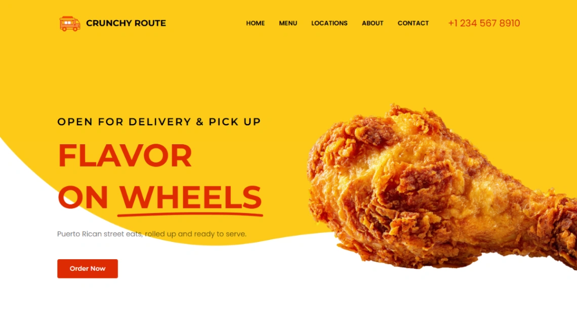 Food truck website template for mobile food vendors featuring menu display, order forms, schedule/location info, contact section, and payment processing for managing food service orders online.