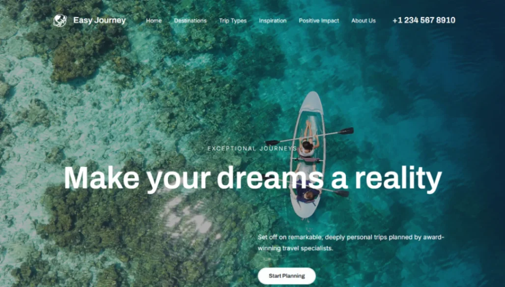 Travel agency website template for tour operators and travel businesses. Features destination galleries, package listings with pricing, booking forms, itinerary details, travel guides, testimonials, a...