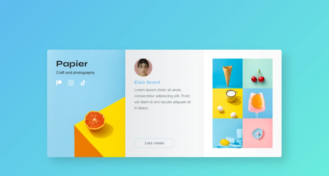 Portfolio website for photographers and craft artists showcasing work with vibrant colorful grid gallery layout. Features artist profile with bio, social media links, project showcase in bold color-bl...
