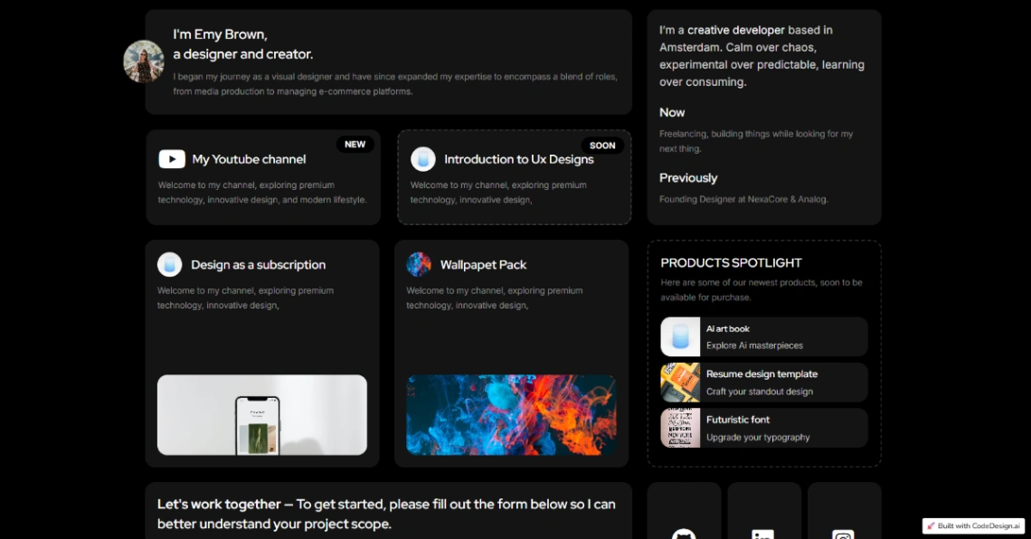 Designer portfolio template showcasing projects, YouTube channel, digital products, and freelance services. Includes bio, work gallery, product shop, service offerings, contact form, and newsletter si...