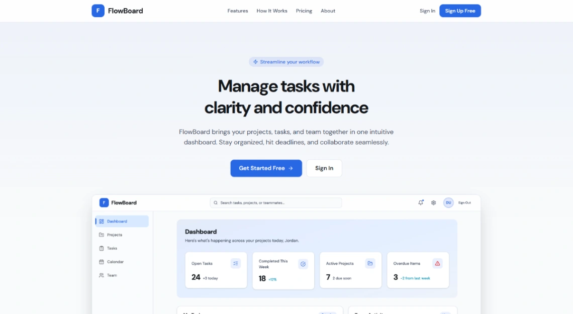 Modern task management dashboard app template with bright blue accents. Features hero dashboard preview, feature grid, "How It Works" section, authentication flow, full-width layout with bold UI eleme...