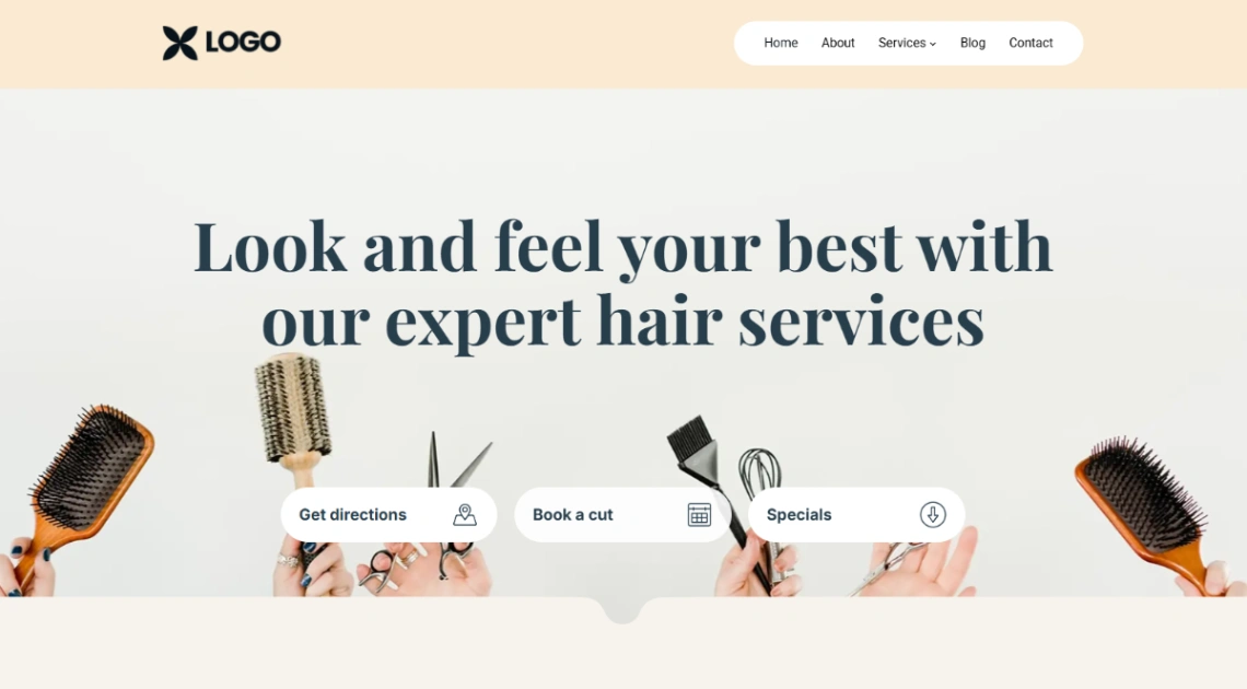 Professional hair salon template with service booking, team profiles, pricing menu, and gallery. Includes hero with CTAs, service options, booking buttons, testimonials, blog, and contact information...