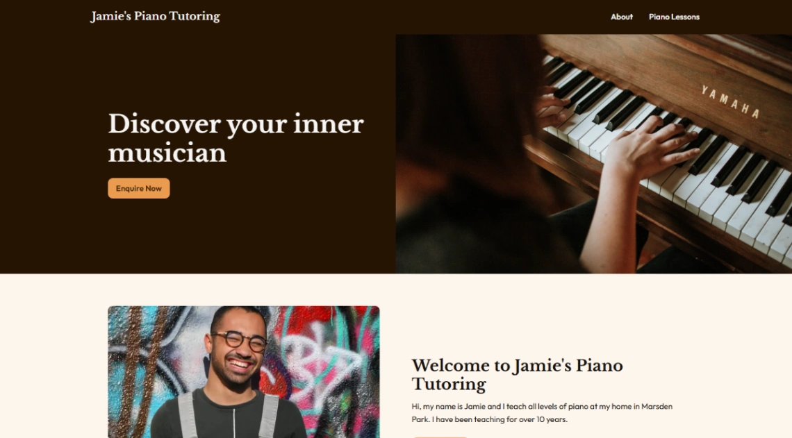 Music lesson booking template for piano tutoring services. This template includes hero with inquiry CTA, tutor bio section, benefits list, free intro lesson offer, testimonials, about page, lessons pa...