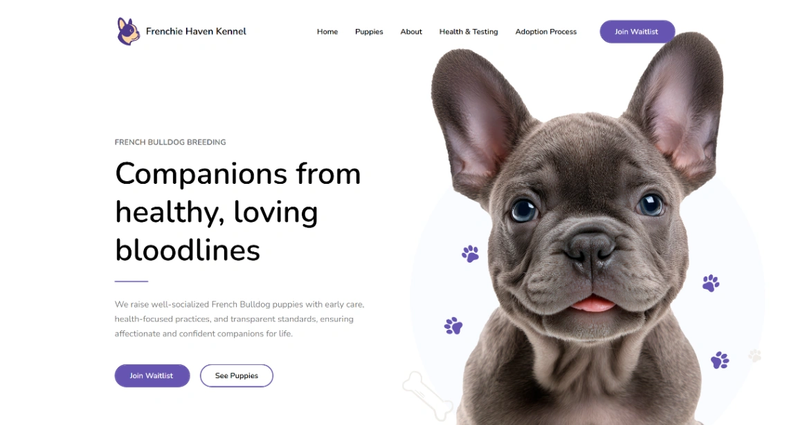 Warm imagery and structured information blocks characterize this digital space for pet specialists and kennels. Essential sections for breed standards, upcoming litters, and heritage details provide a...