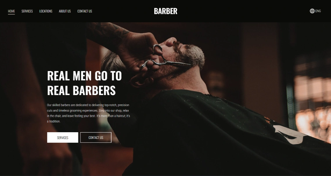 Classic photography and structured service lists define this digital environment for barbershops and hair salons. Dedicated sections for pricing, hot towel shaves, and contact details provide a profes...