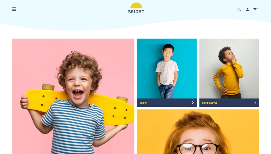 Playful image grids and structured product carousels define this digital environment for children's fashion brands and boutique retailers. Integrated blog sections and social media galleries provide a...