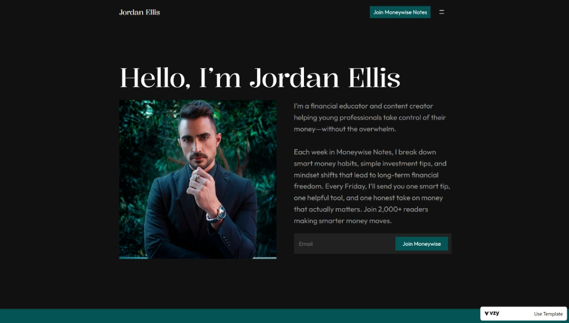 Empower young professionals with this native personal template. Designed for content creators and financial coaches, it features specialized newsletter subscription blocks and curated insight sections...
