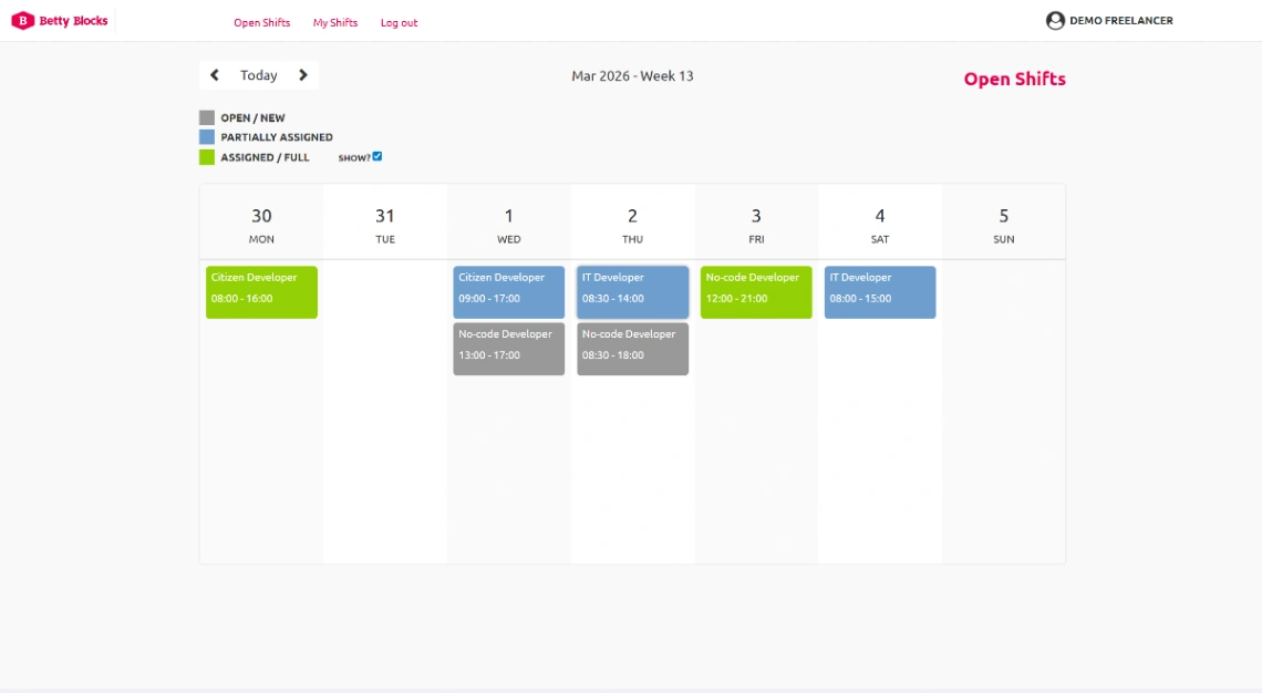 Schedule jobs in shifts with qualification filtering for freelancers and contractors. Features drag-drop calendar builder, role-based portal views, automatic shift coloring, and metadata like earnings...