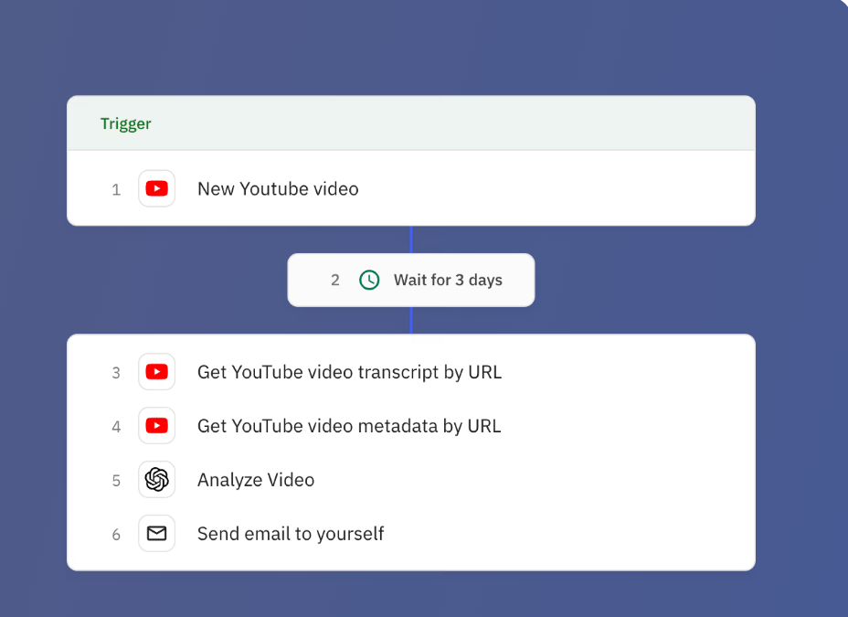 Automatically analyze YouTube videos from a channel after publication. This template monitors for new uploads, waits for engagement data, retrieves transcripts and metadata, then uses AI to analyze ho...