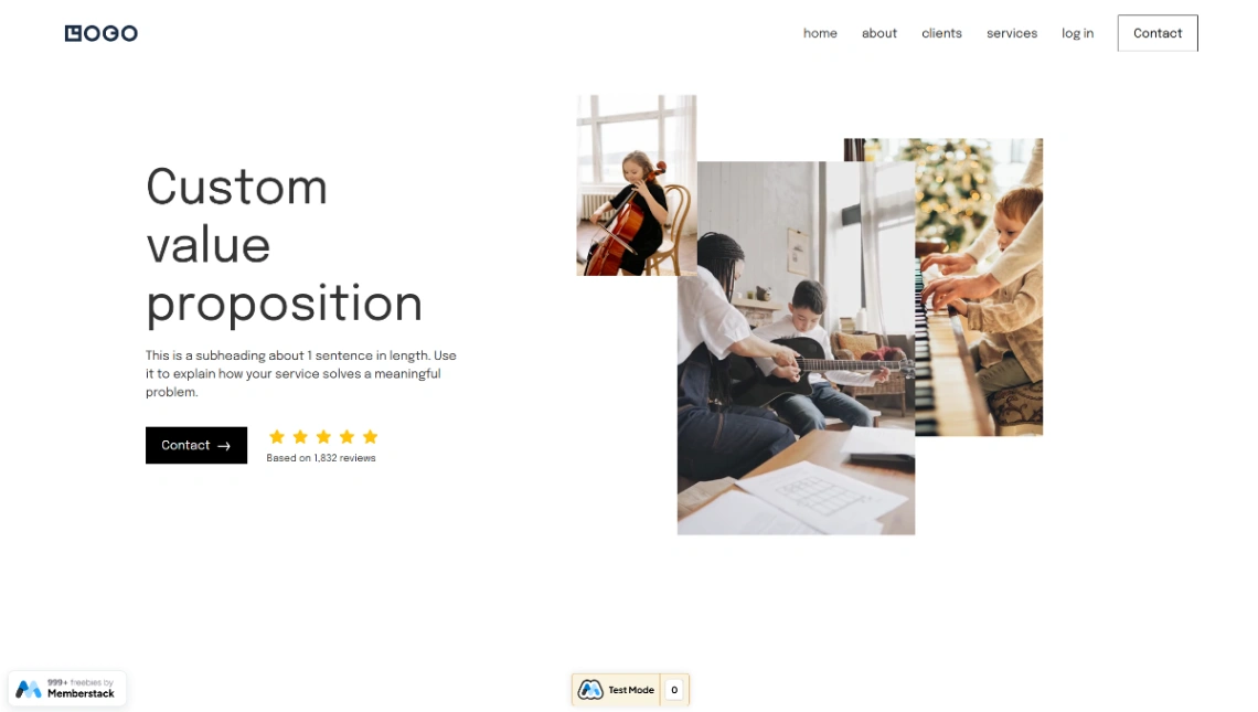 Sell music lessons and classes with client portfolios and success stories. This template features login page, student case studies, service listings, testimonials, and contact forms powered by Members...