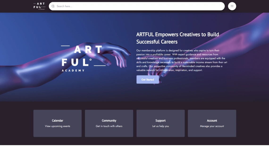 Teach creative skills and build an art community for aspiring artists. This template features interactive portfolio showcase, member resources, and professional design for creatives turning passion in...