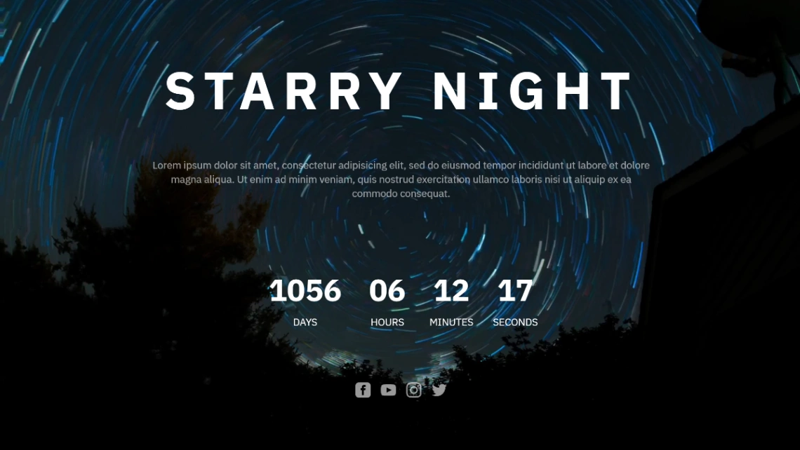 Event announcement one-page template designed to promote upcoming events with countdown timer. Features prominent event headline, descriptive event information, background video for visual impact, and...