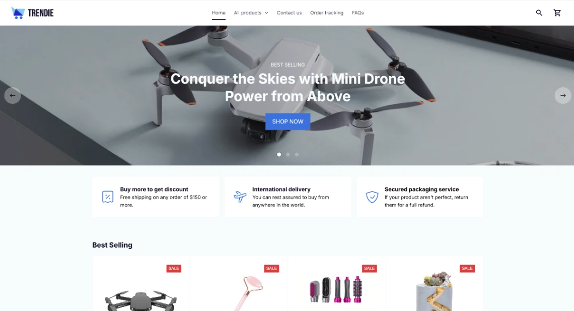 Diverse product eCommerce template featuring electronics, beauty, fashion, and home goods. Includes hero section, product categories with lifestyle imagery, featured collections, customer testimonials...
