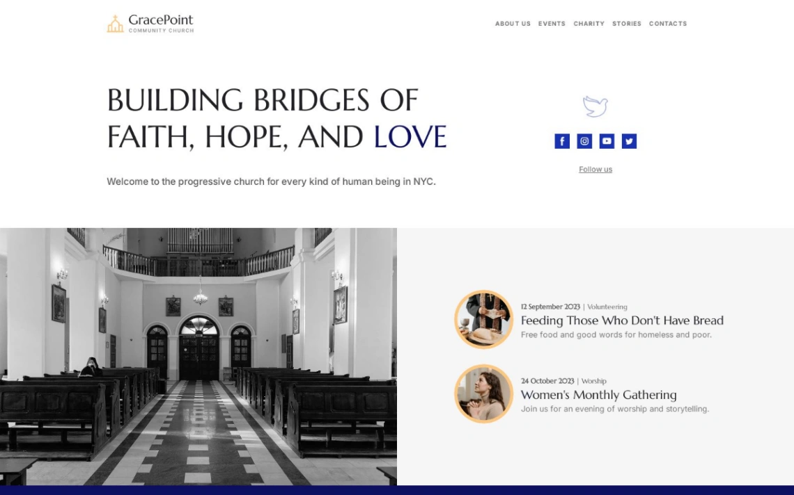 Modern church website design for religious organizations and faith communities. Features multipage layout with professional design for sharing church events, education content, and community informati...