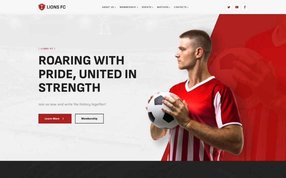 Dynamic soccer club website template showcasing team pride and community engagement. Features hero section with player imagery, team statistics display, player roster with profiles, coaching staff bio...