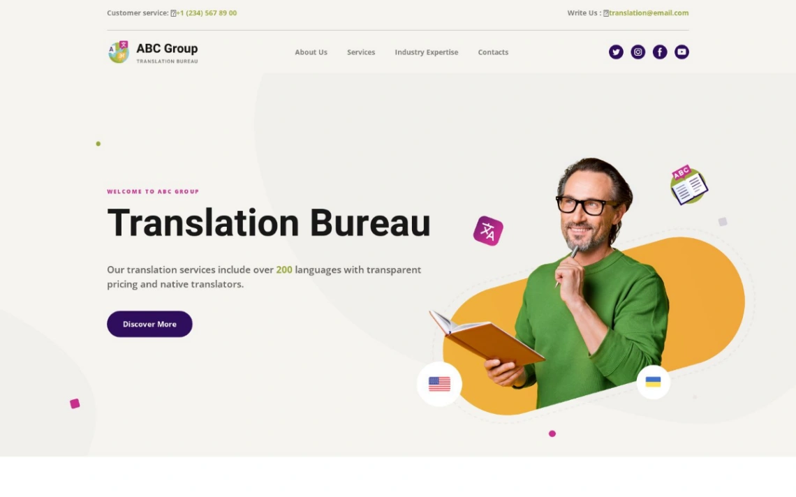 Professional language translation website template for interpretation and translation services. Features multipage layout with service descriptions, language specialties, interpreter profiles, pricing...