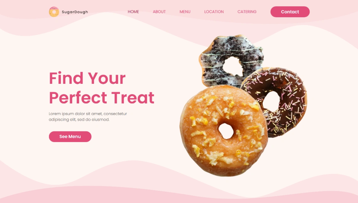 Indulgent donut shop website template for sweet treat retailers. Features bestseller showcase, brand story section highlighting the bakery, multiple location finder across three locations, catering se...