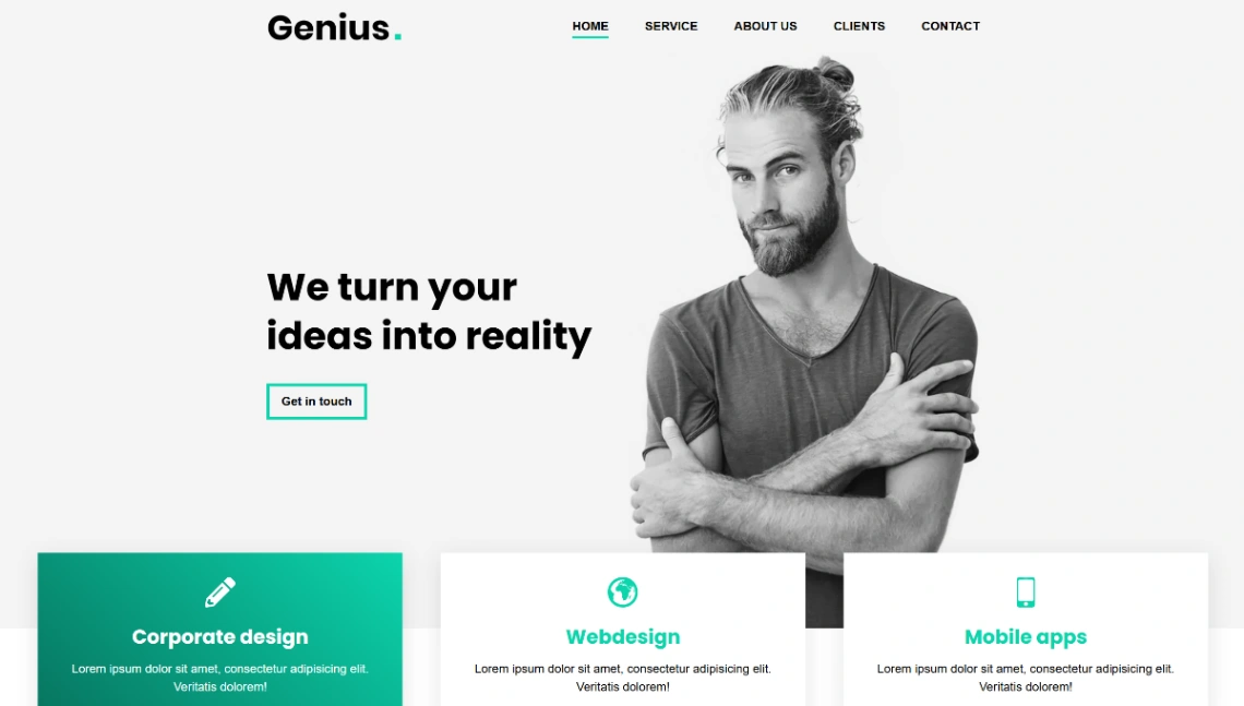 Design agency portfolio template showcasing creative services. Features service categories including corporate design, web design, and mobile apps, team member profiles, portfolio gallery, skill displ...