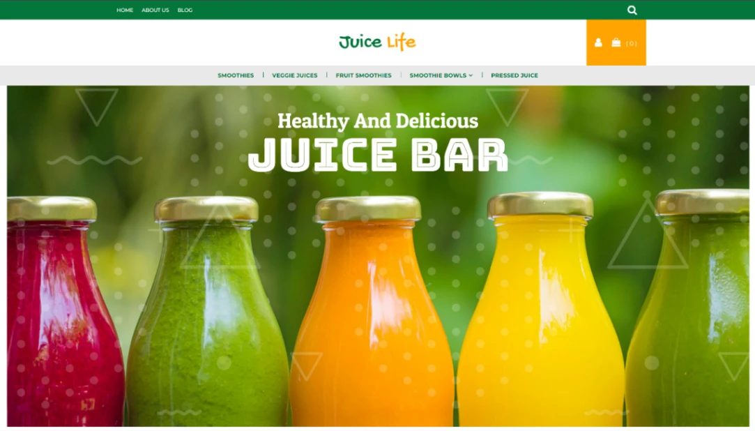 Bright and colorful beverage store eCommerce template. Features vibrant fruit-inspired color scheme with basil green and orange tones, juice and smoothie product showcase, fresh design aesthetic, and...
